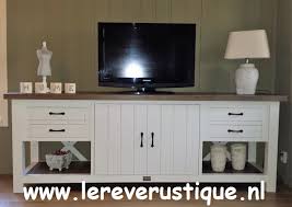 Overweeg een tv kast met lades of deuren om spullen netjes op te bergen en het rustieke uiterlijk te behouden.